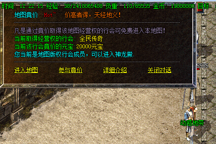 5.行会竞价地图:此地图行会必争之地,壮大行会之宝地。行会竞价成功后所属本行会会员均可进入。 爆率指数:☆☆☆☆☆ 经验指数:★★☆☆☆ 元宝指数:★★★★☆ 激情指数:★★★★★ 荣誉指数:★★★★☆