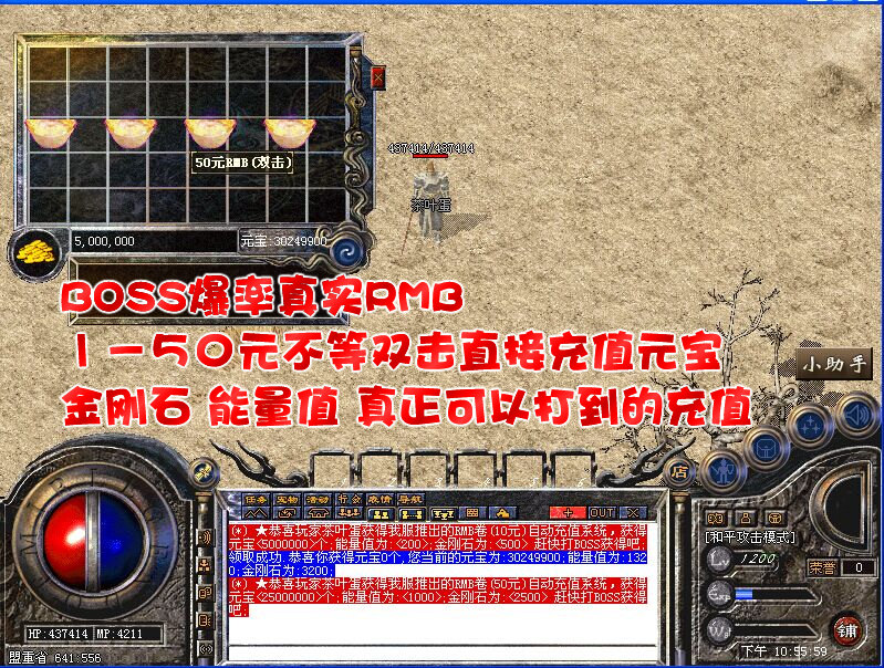 15.新增加RMB充值卷 双击后自动充值到账户内包含元宝 金刚石 能量值 BOSS爆出 |