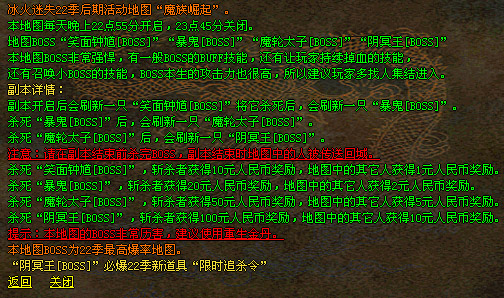 增加活动副本“冰火之歌”,每6小时开放一次,集合全服BOSS,无条件进入。