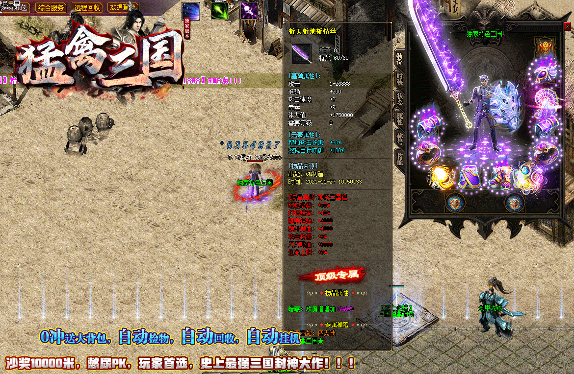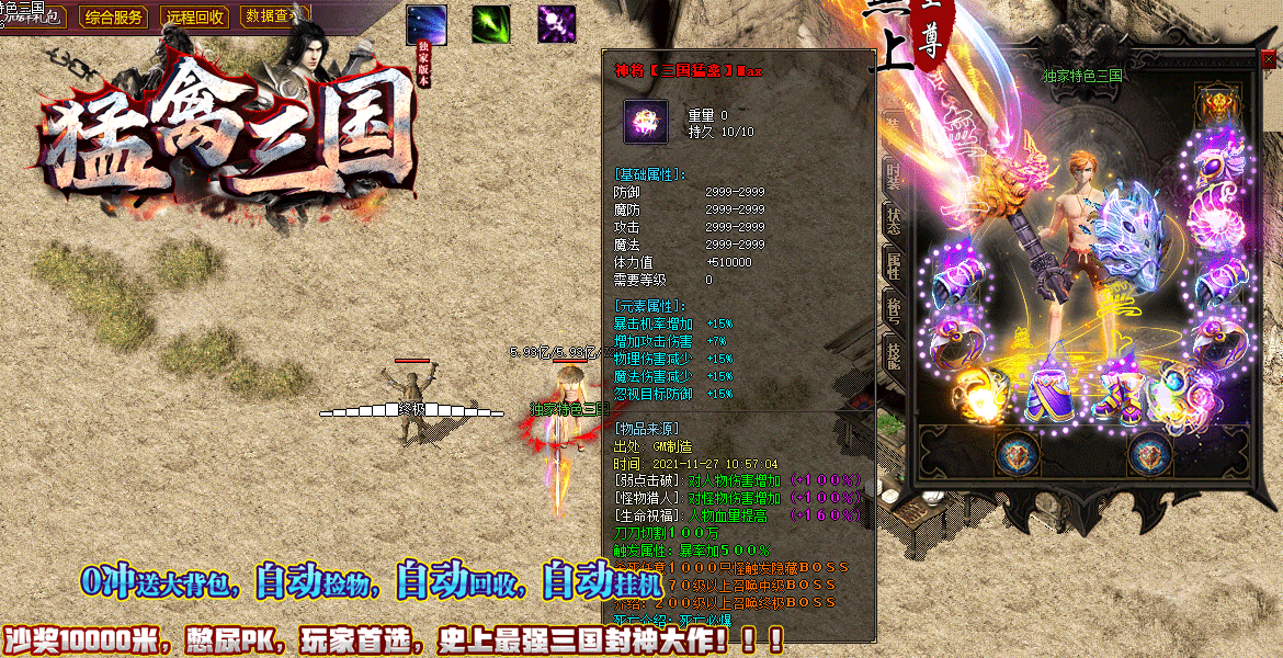 0冲送大背包,自动捡物,自动回收,自动挂机,沙奖10000米,憋尿PK,玩家首选,史上最强三国封神大作!!!