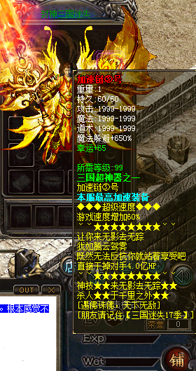 游戏介绍⑥ >>本次更新特意加入了装备加速系统加速链③号为本服终极加速项链,速度可增加60%杀人越货必备神器,让PK激情无限,更多精彩
