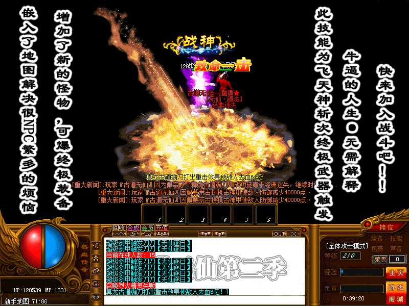 游戏介绍 >>独家火爆新版,全新超炫3D地图,超靓新装备,怪物。全天活动不断。!