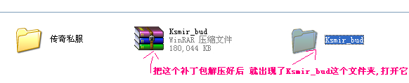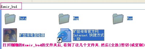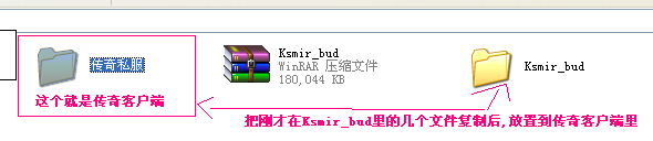 2:解压完成后,这里出现Ksmir_bud这个文件夹,大家记得把里面的几个文件复制出来,(不是整个文件夹放到传奇目录,那样的错误的!) 打开这个文件夹后,进入下一步操作。