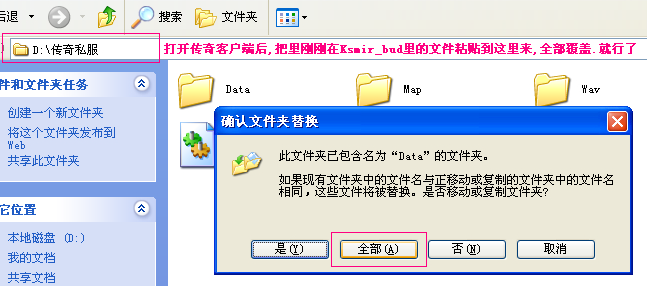5:进入传奇客户端的目录后,看到里面有很多文件,大家可以不用理会。直接在空白处点鼠标右键。选择粘贴。把刚刚我们在补丁文件夹里的几个文件粘贴到这里。覆盖全部。