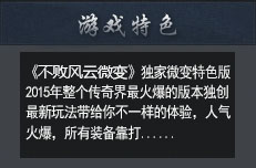 【特色系统】:独家创新元神修炼.渡劫轮回.击杀BOSS获得BUFF效果.元宝彩蛋.骨灰嘉奖.幸运转盘.在线奖励。超越传统,努力创新! |