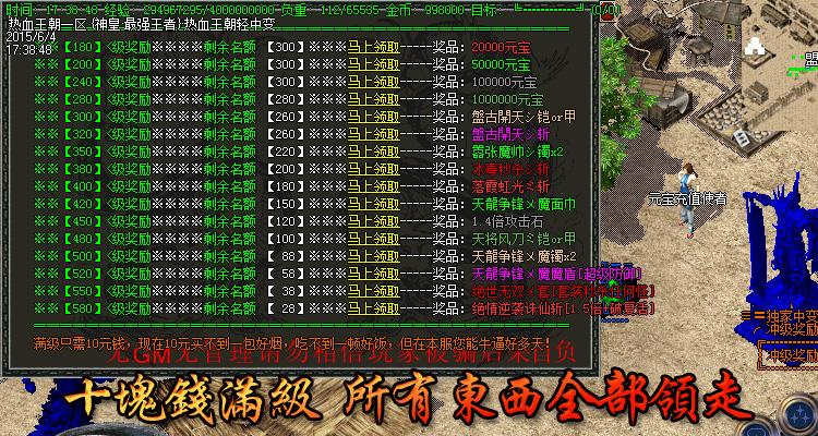 升级介绍:草根消费 十元满级 独家制作 元宝好打 装备狂暴 终极也暴 第一无二 欢迎体验!