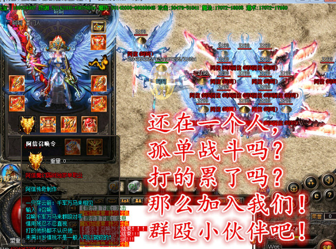 游戏介绍① >> 阿信单职业,放心下载,支持10周年等所有客户端! 游戏介绍② >> 打破传统观念玩法,一切等你来体验! 游戏介绍③ >> 还在一个人孤单战斗吗?打的累了吗?那么加入我们,群殴小伙伴吧 游戏介绍④ >> 前所未有的激情,来群殴怪物,点根烟指挥吧 游戏介绍⑤ >> 菊花洗干净了吗兄弟?召唤阿信带你装B带你飞。。 游戏介绍⑥ >> 还担心没有人气吗,还是担心下一个菊花被爆破的可能是你 游戏介绍⑦ >> 每日多区重金广告-保证人气 -保证激情 -游戏愉快 -公司长期运行 -绝对专业系统化! ------------------------------------------------------------------------------------------------------------------------------