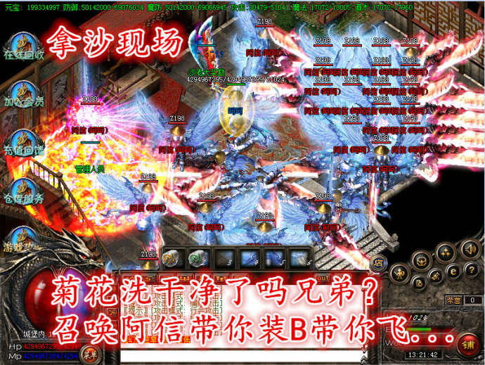 前所未有的激情,来群殴怪物,点根烟指挥吧 菊花洗干净了吗兄弟?召唤阿信带你装B带你飞。。 还担心没有人气吗,还是担心下一个菊花被爆破的可能是你 千年蛇妖,牛魔王,绿巨人,邪恶大天使,印度土豪,古代战神,巫师:虚左能呼,千年邪帝,尾兽各大BOSS等您来体验。。