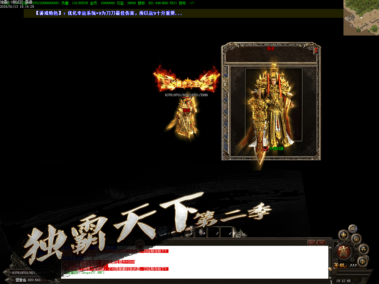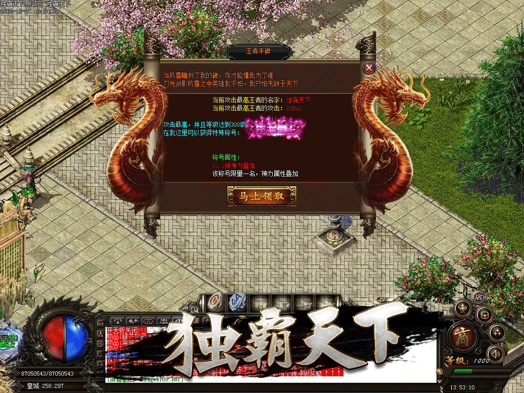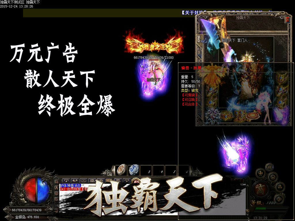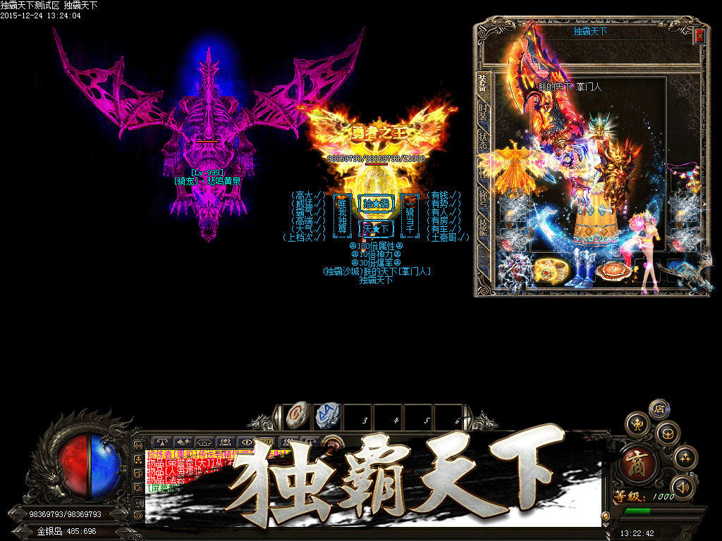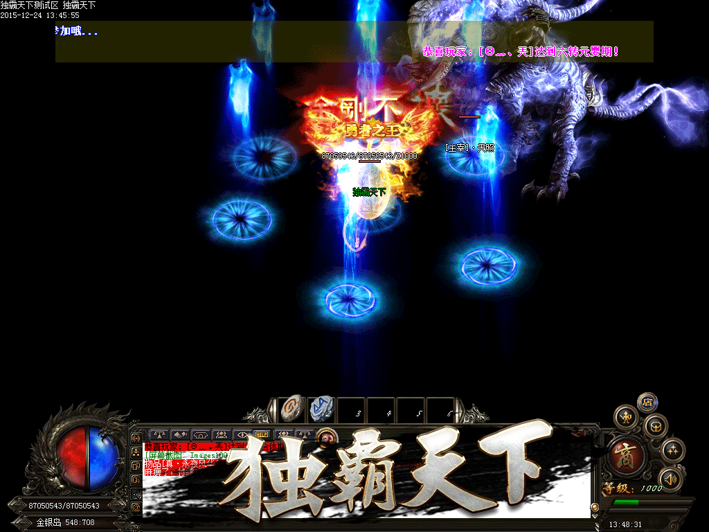 [独霸天下正式版]之霸道无双 更新介绍以及玩法修改: 二,添加直接强化道具,修改强化属性,整体强化可获得更好的属性加成。尽量让玩家能简单快乐的游戏! 三,游戏整体布局全部修改,完全推翻第一季玩法模式!这不是一句简单的话。游戏的变化希望你们进入游戏了解 四,修复已知所有BUG,与不合理的地方! 再次声明这不是简单的更新!