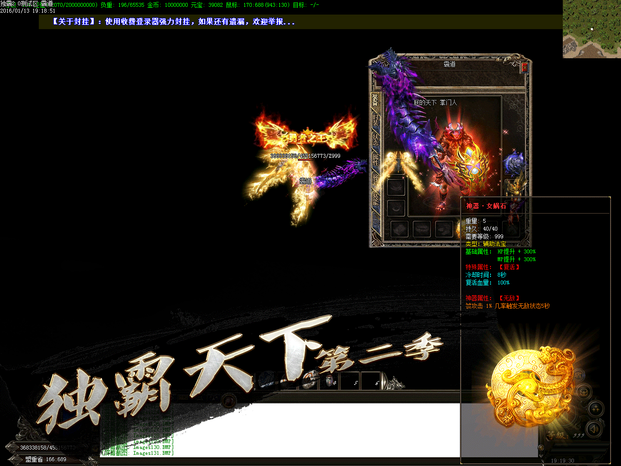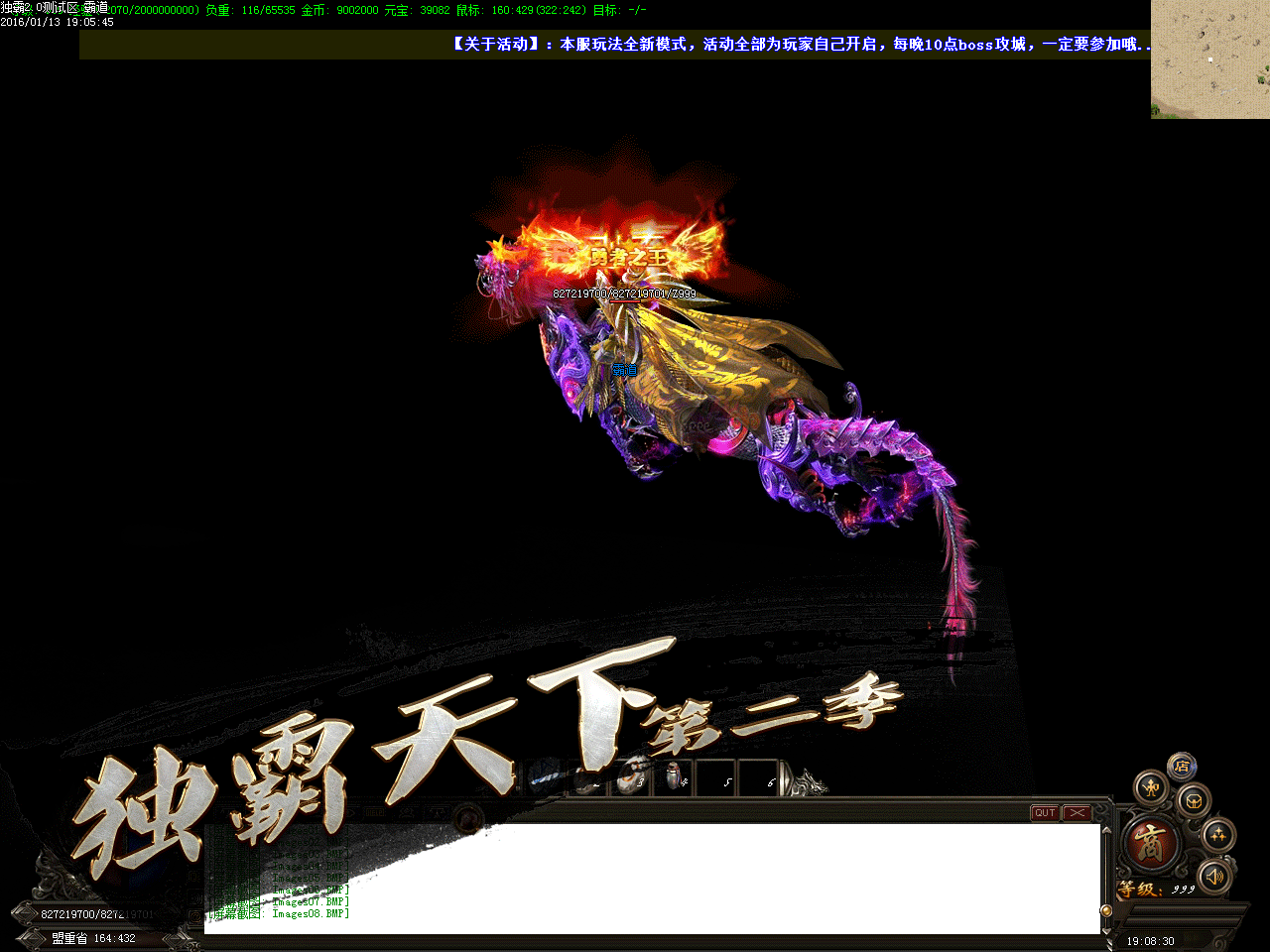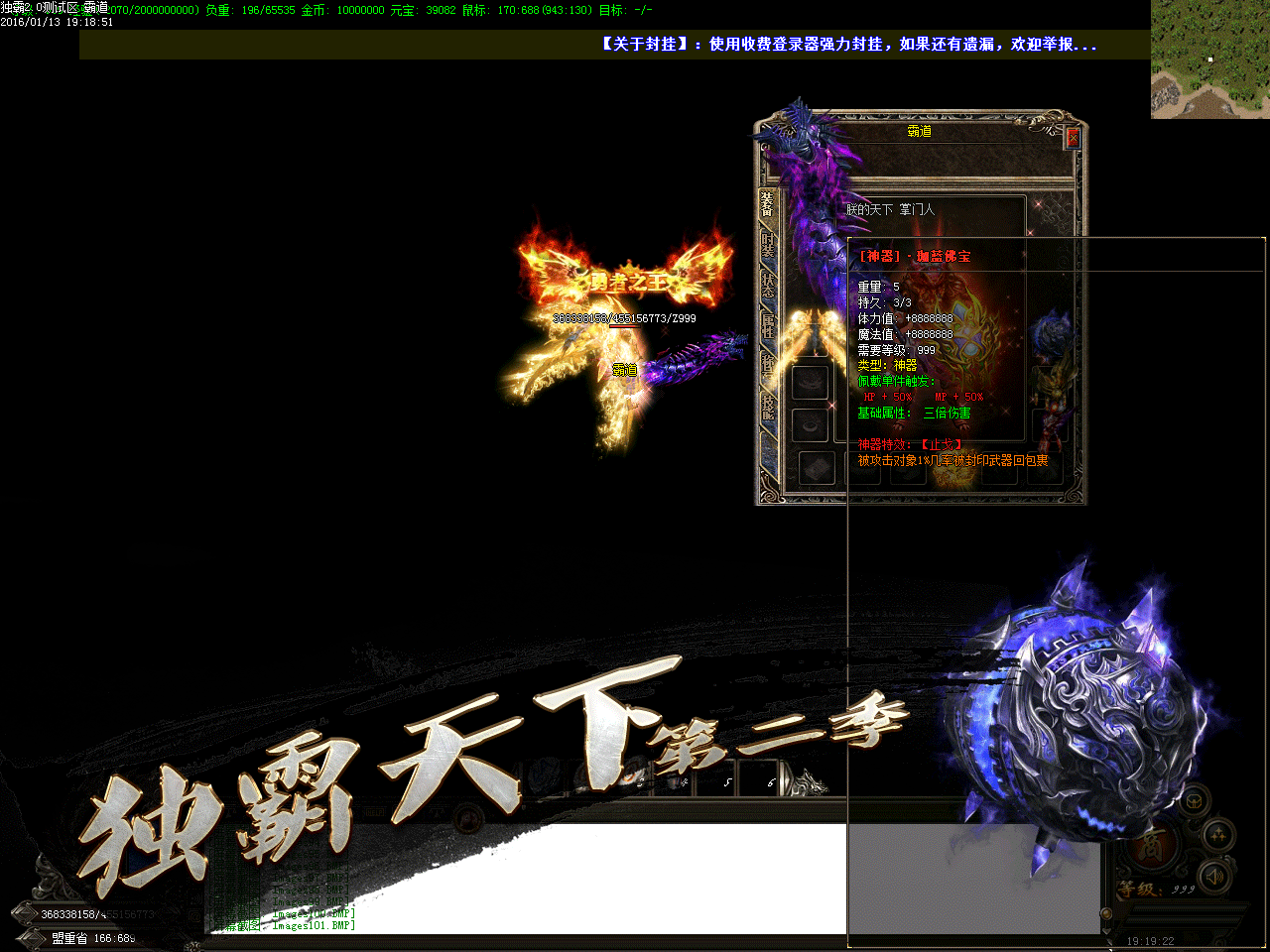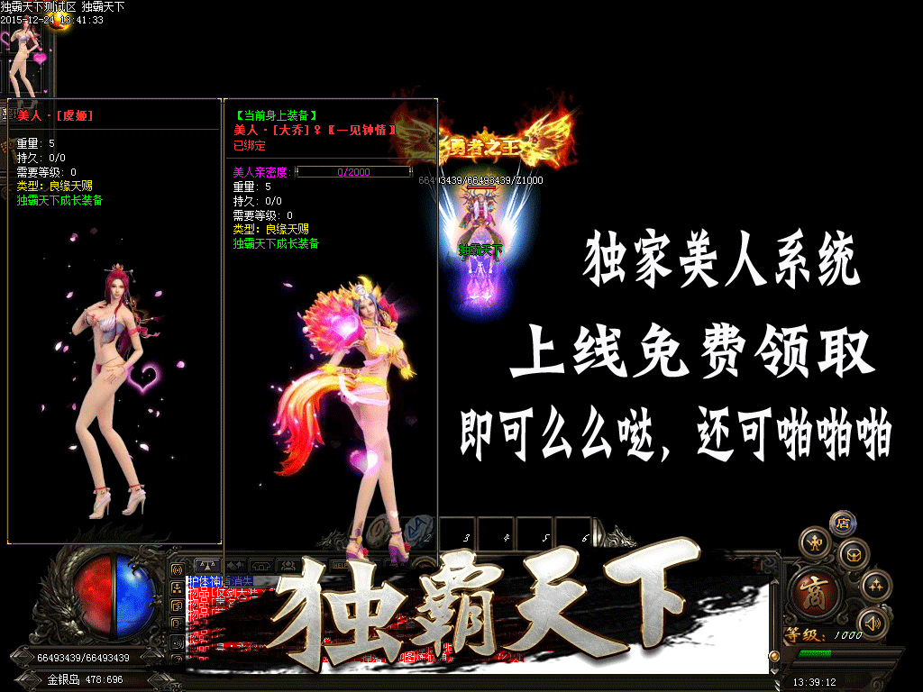 [独霸天下正式版]之霸道无双 更新介绍以及玩法修改: 二,添加直接强化道具,修改强化属性,整体强化可获得更好的属性加成。尽量让玩家能简单快乐的游戏! 三,游戏整体布局全部修改,完全推翻第一季玩法模式!这不是一句简单的话。游戏的变化希望你们进入游戏了解 四,修复已知所有BUG,与不合理的地方! 再次声明这不是简单的更新!
