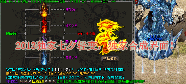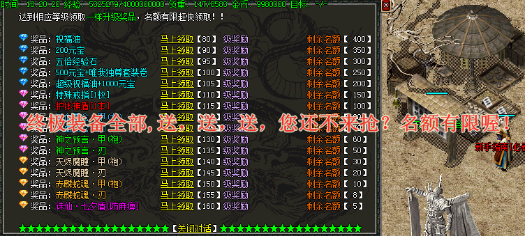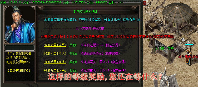【冲级奖励】:从80级开始每升一级都有相应物品赠送,升级奖励非常丰富!160级奖励【诛仙·七夕盾牌】 (本服唯一防麻痹)!