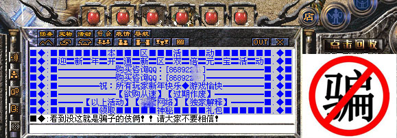 也许玩家还看不懂上面那张图所代表什么?请听客服给你们细细道来!首先,你应该确定自己联系的是不是真正的管理? 本服的管理和你私聊字体是红色!并且可把你召唤出盟重省地图的任意坐标!如果2样条件都满足可以确定100%是管理!一定切记! |