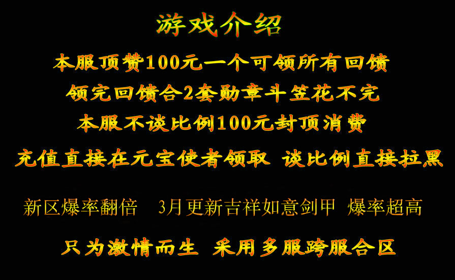 【元宝比例】:此版本为独家特色1.80暴风超爽合击最新版,一切装备靠打,终极全部爆绝无任何保留!!!