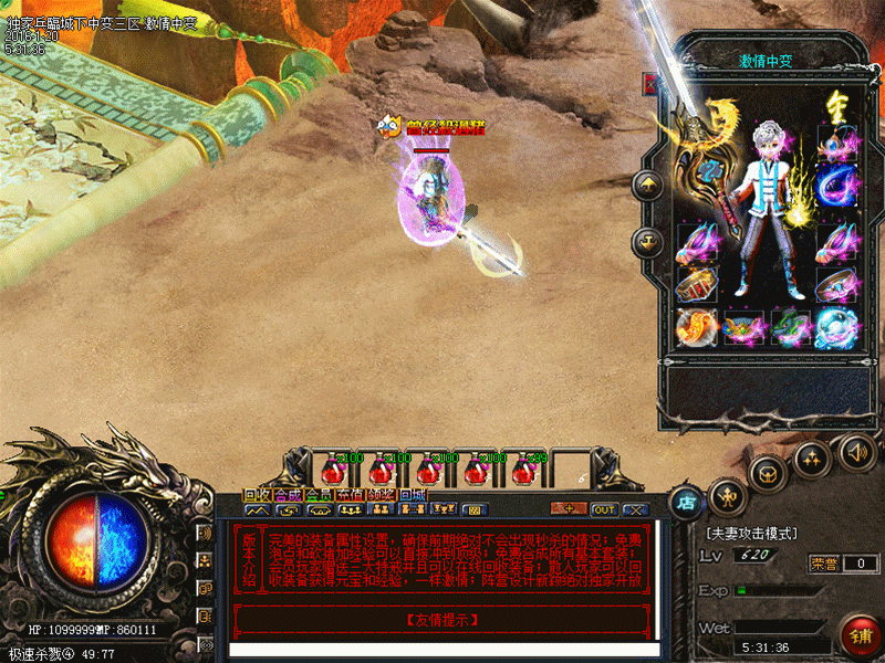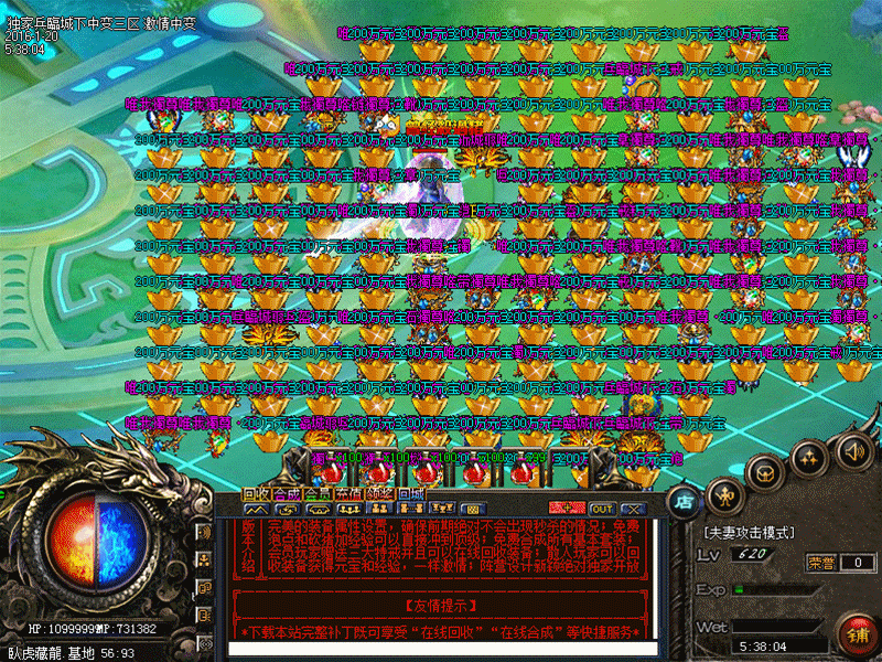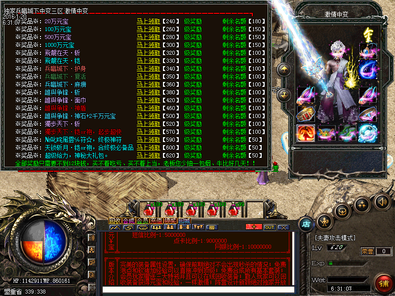 【元宝比例】:元宝比例1:500万 点卡:多送90% 网银1:多送100%,充值越多比例越高,本服无GM管理,游戏说是GM的都是骗子!