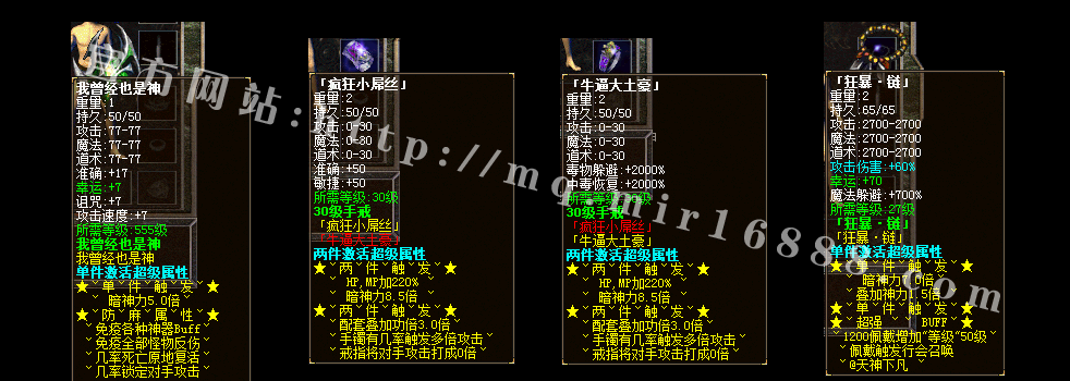 4、本服为多元化迷失,告别单一模式,从等级,装备,玩法都较为新颖.等级1205级满级,满转33转. (服务器会爆出加等级项链) | ||||
