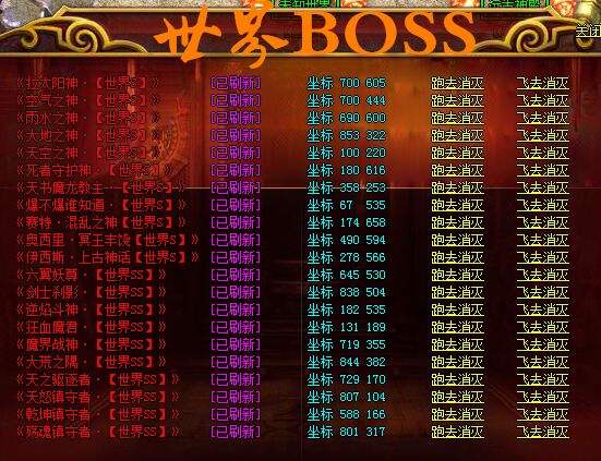 7:本服除各地图的大BOSS以外还增加了世界boss系统真正的打不完的boss!合成神王令牌的所有材料,符文的所有材料,高级材料!以及大部分神装,RMB卷轴,在世界BOSS,以及九柱BOSS,会员BOSS身上都是随机必爆一件的!所以说散人玩家千万不要忽略了世界BOSS哦!