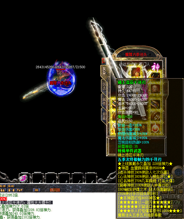 【游戏介绍】:9.五季终极套血量为30亿!攻击在4W多!倍数为300多倍!绝对是一款不爆血!不爆攻击!不爆倍数的迷失服!BUF众多给你其乐无穷!赶快来加入魔尊五季吧!带给你最大的激情!