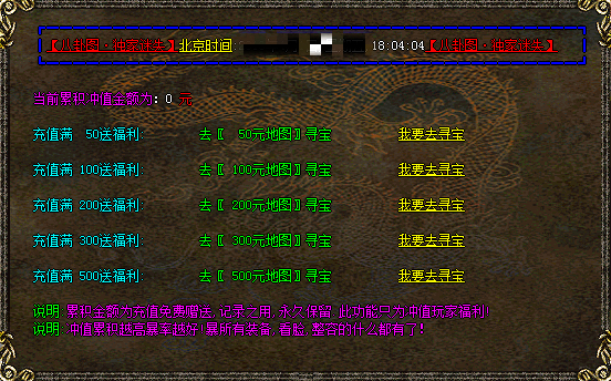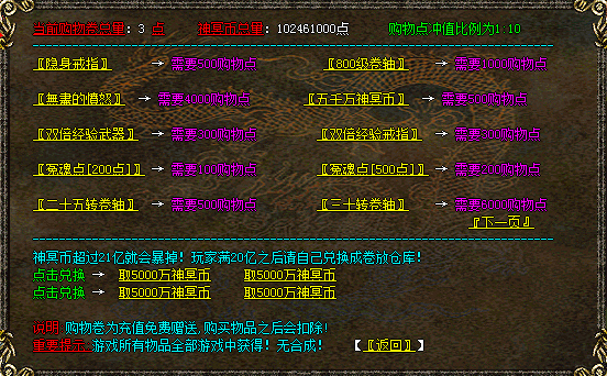 充值比例:1RMB=15W元宝+1充值点+10积分,点卡送80%,网银送100% |