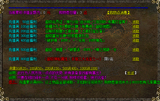 【游戏介绍】:元宝比例:1:15W,充值积分1比1,消费积分1:10! |