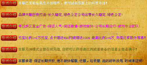 【版本介绍】:短信充值(1:20000) 点卡(送80%) 网银(送100%) 所有充值统一平台!本服不会以任何一种方式高比例卖元宝!