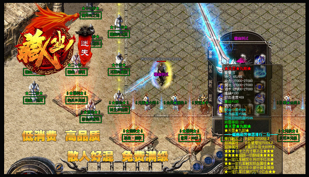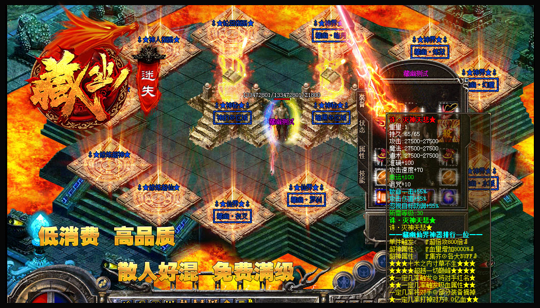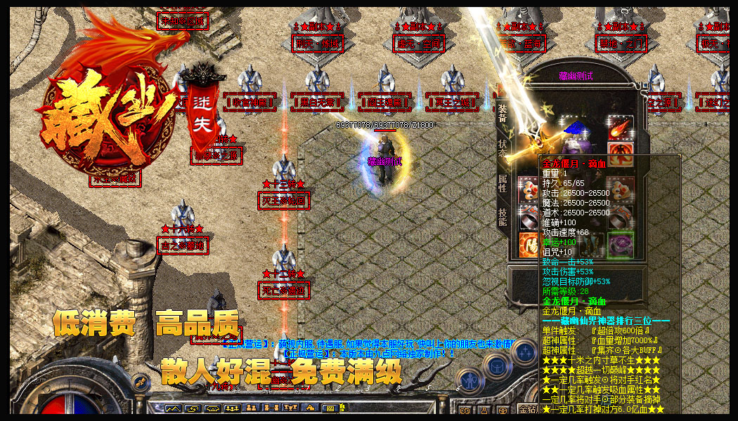 - 【游戏公告】:本服神器上百件,圣器上十件,只要你打到恭喜您可以完全无任何等级限制,0级佩戴!!