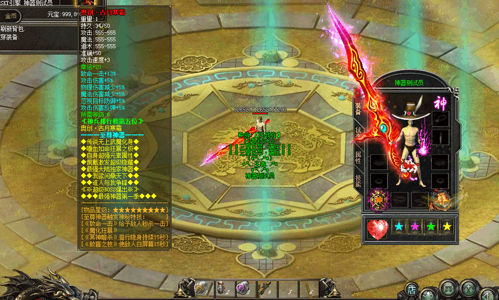 - 【游戏内容】:本服新增加BUFF神器特殊装备,宝贝中的宝贝,神秘神石,等等