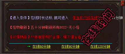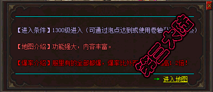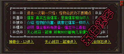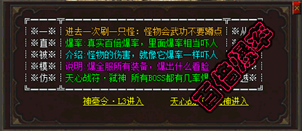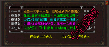 - 【特色地图】:五倍暴率、十倍爆率、百倍暴率、封号地图、众多特色副本!