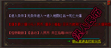 - 【游戏声明】:本服每天活动爆人民币积分100--200元,所有怪物都几率爆人民币积分,绝对是散人的逆袭。