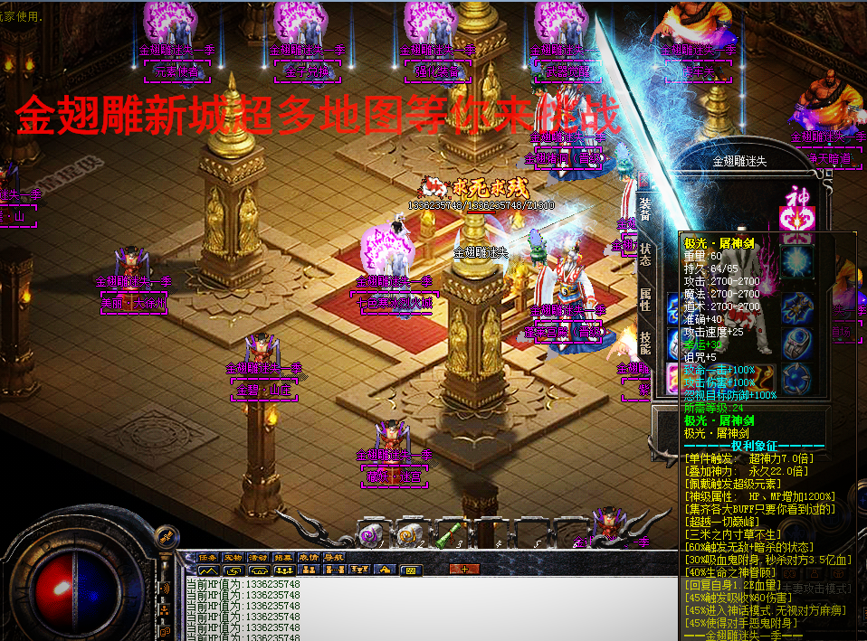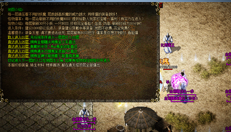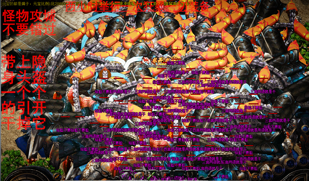 新手上线送人形BB两个起步好帮手和高级秒杀符.秒杀10亿以下BOSS.@召唤 唯一终极宝宝 活动必强!每两小时举行的怪物攻城是散人的福利.爆一切装备.刷新50只BOSS沙巴克区域 1.屌丝玩家可以在线奖励领取会员和防火宝石.打火怪必备.免费15转四级技能.专享地图 2.在线奖励和升级奖励不要错过.屌丝可以2个号一个在线奖励.一个去打宝.双相结合 3.当你转生搞到20转之后.那么你变可以进入金翅雕新城寻找终极装备.所有装备全部爆. 4.特别推荐土城特殊地图.镇魔塔共20层.镇妖塔3层.幻境十重天.三大副本.散人终极挑战.没有实力不要去送死 5.每个地图都会刷新一只世界BOSS运气好直接掉终极.推荐的地图是散人的福利.爆率都是相当客观 6.土豪玩家直接冲个288进入所有地图和充值地图.不要担心有隐藏回馈.GM发誓有隐藏回馈死全家 7.元宝和金翅雕币很好打.转生等级很重要.满回馈为288.想在本服谈比例的GM送你回家日你妈 8.所有地图.所有充值地图.所有大陆.屌丝玩家不花一分钱一样可以进入.时间证明一切!不要越级打怪 9.本服为复古模式版本 不是秒杀服.综合技能和BUFF为一体.!金翅雕迷失一季长久稳定.不断更新