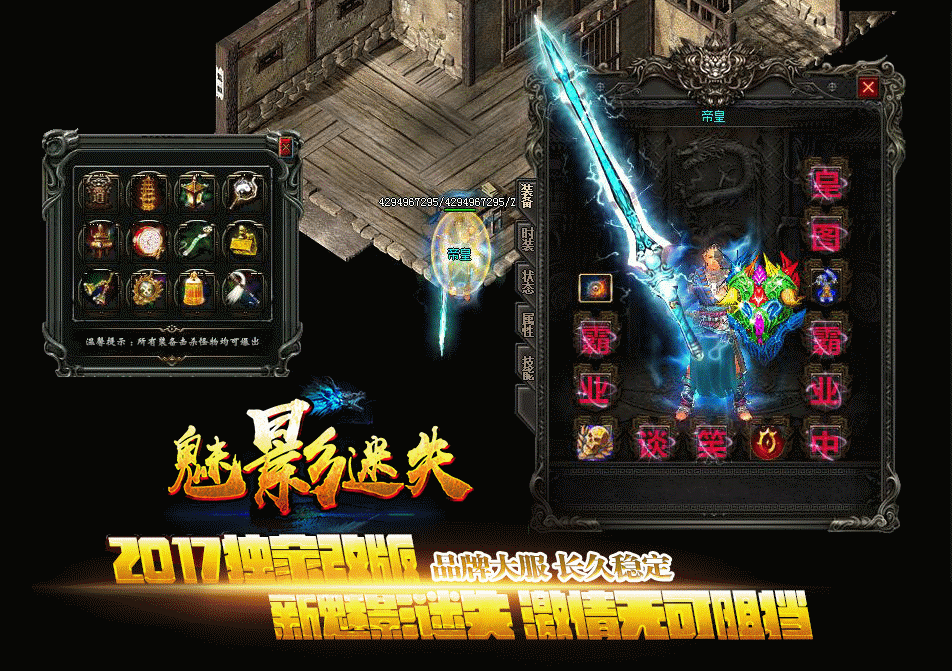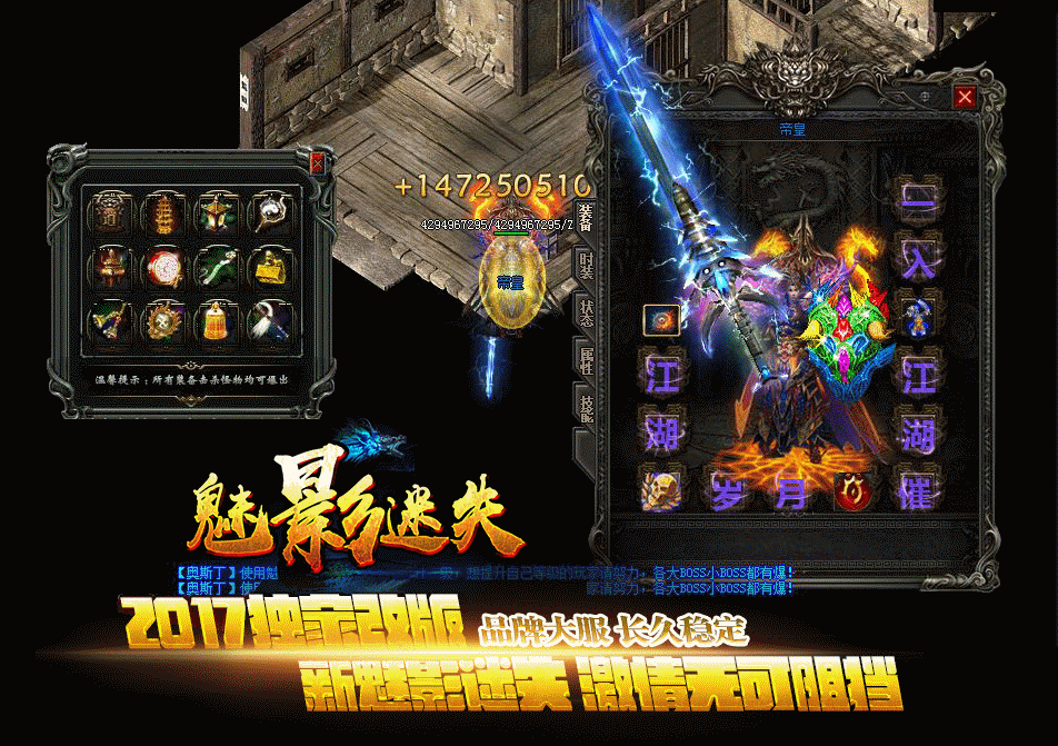 - 【游戏公告】:全新玩法.超绚BOSS.全新BUFF.超多地图(100张打怪地图)!