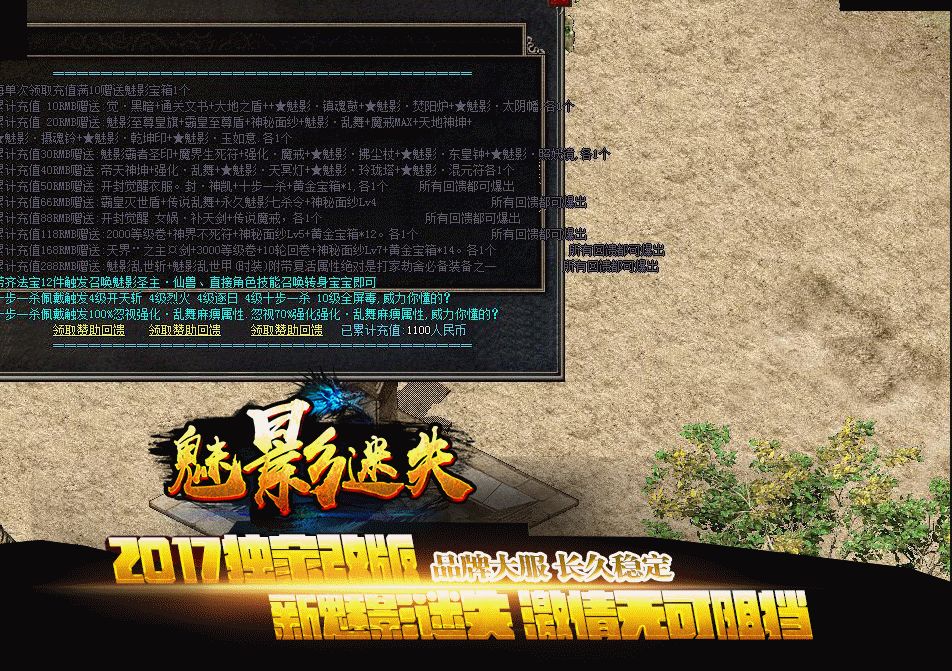 - 【游戏公告】:1:200W元宝+1000魅影币 点卡赠送100%,网银赠送120%