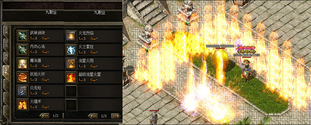 火龙烈焰.大范围群体攻击.机率燃烧目标.流星火雨.小范围多次攻击.每次击中都会对目标造成两次伤害