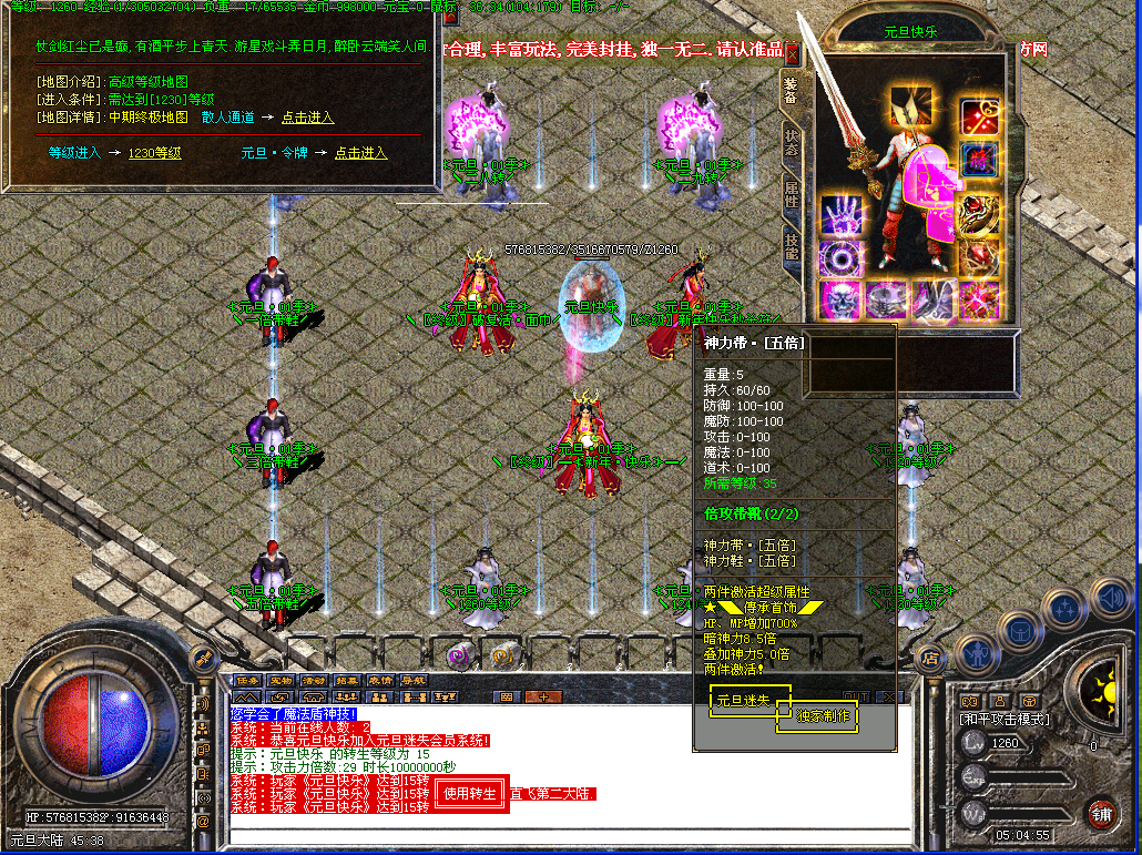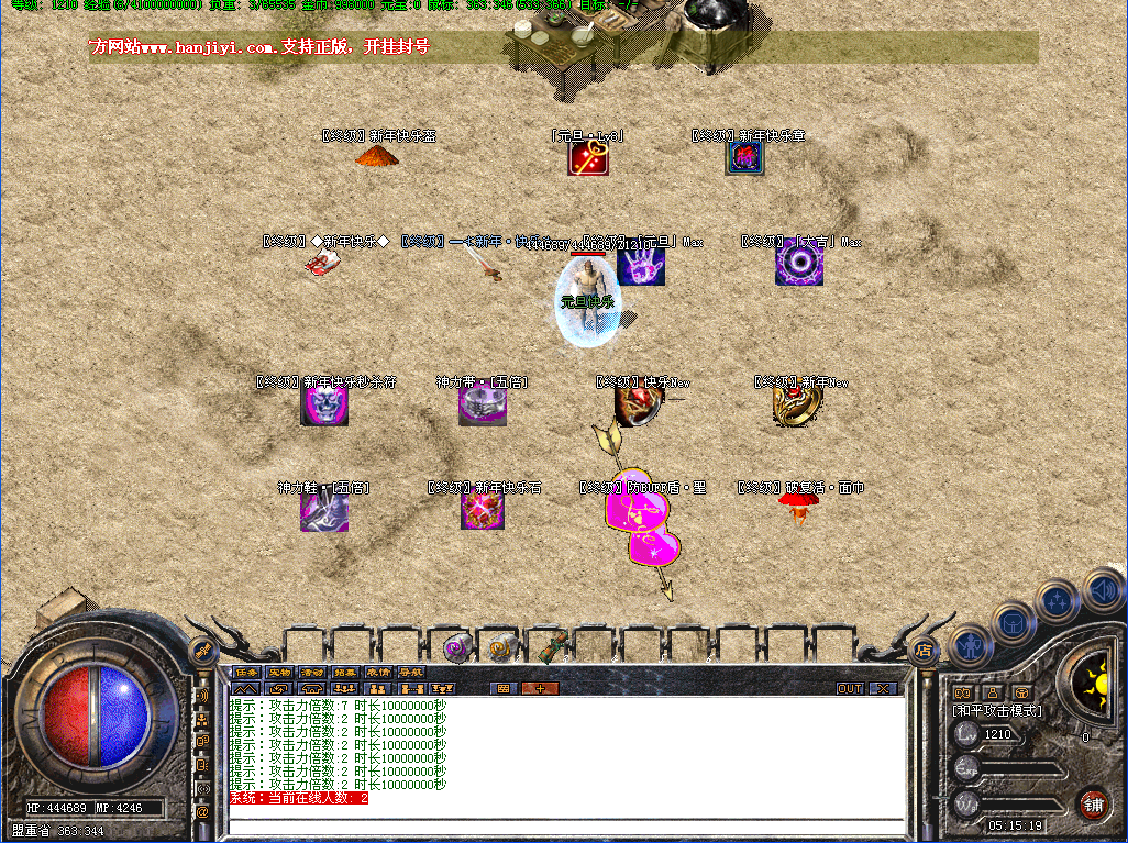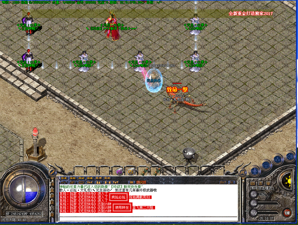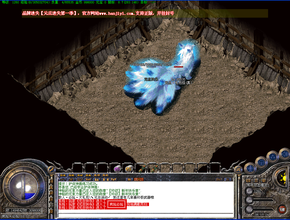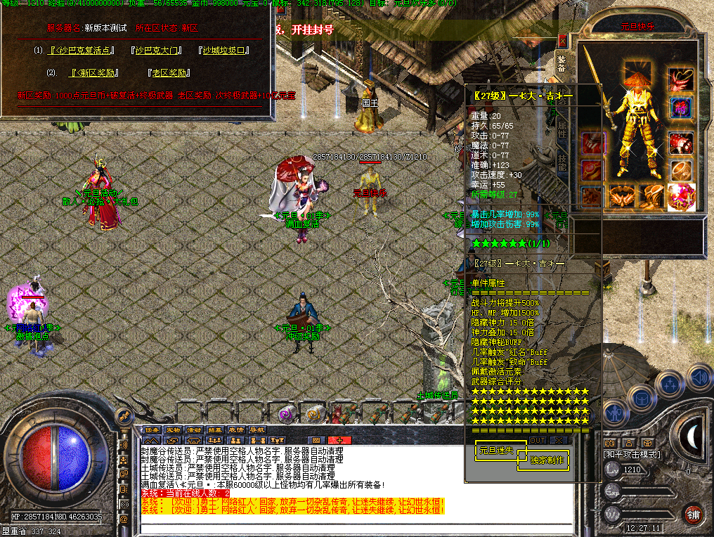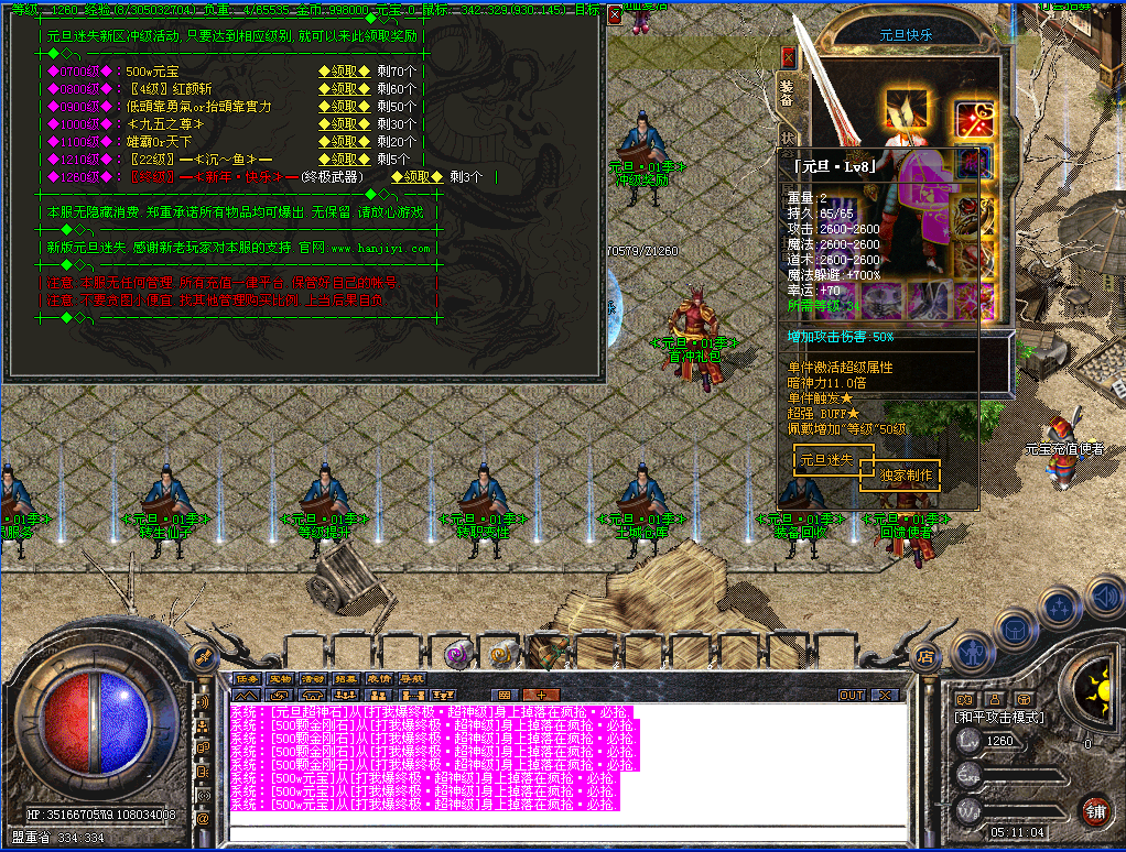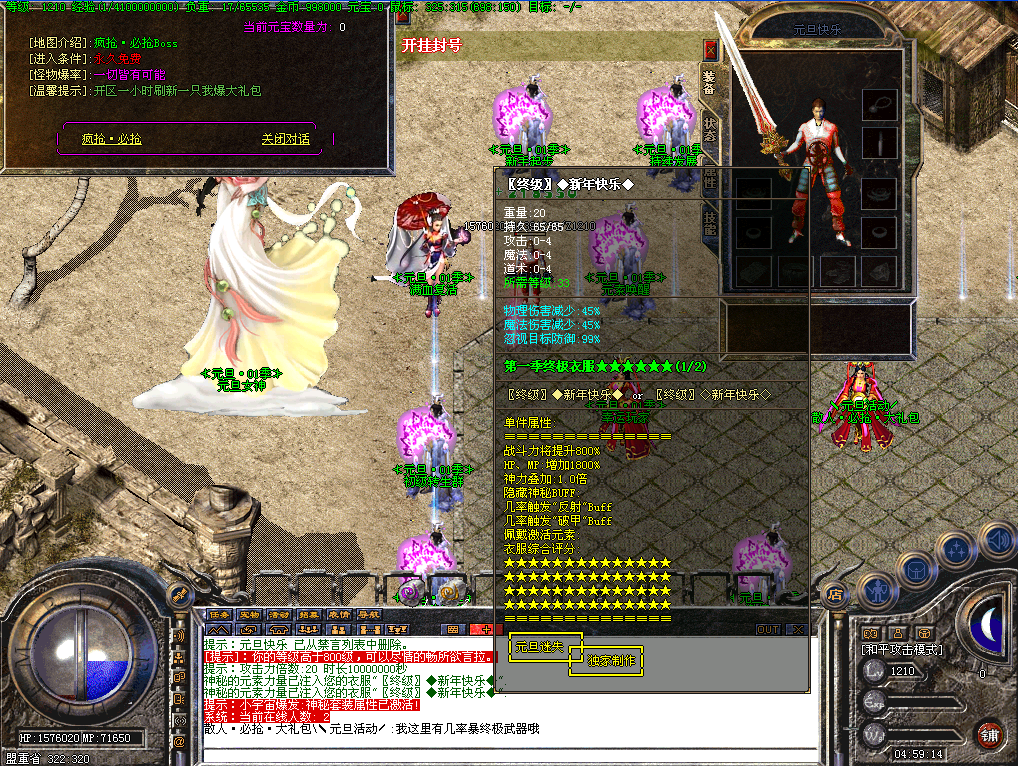 开区一小时活动地图刷新一只元旦·礼包怪(真)最低爆88元礼品,第2大陆刷新一只元旦·礼包怪(假)最低爆38元礼品,每4个小时封魔谷随机刷新一只元旦礼包怪(真),散人记得去打哦!