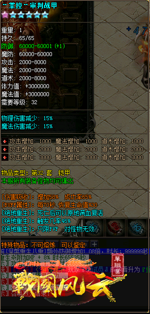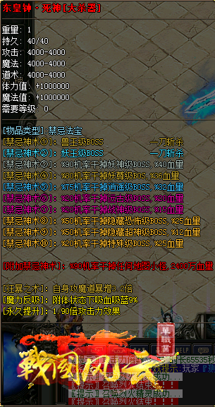- 【版本介绍】:称号获得全服所有怪物均爆战国币,所有装备全爆