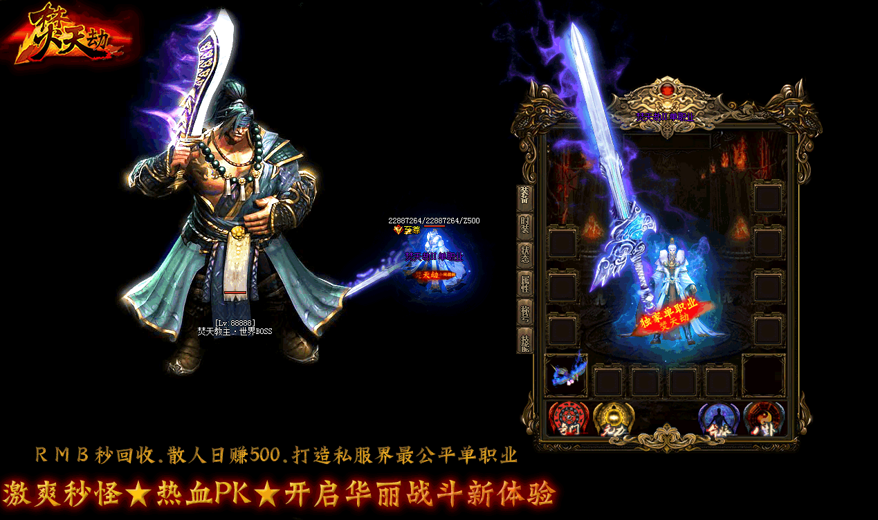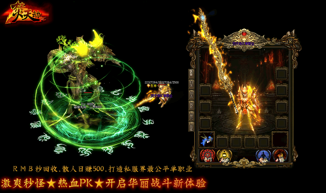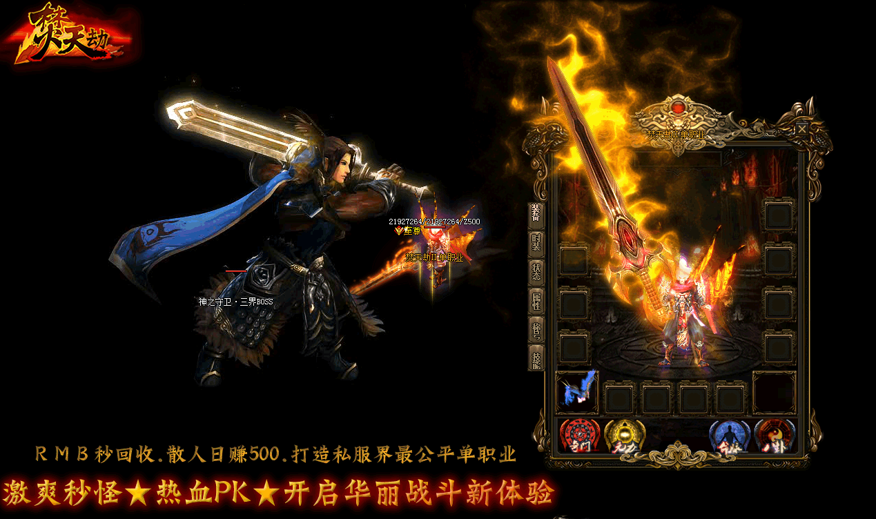 游戏介绍:焚天劫良心团队打造!本服特点长久稳定.元宝好打.打架超级爽.散人好混.打金首选.全方位的更新回收!玩一样的钱!回完全不一样的本!立志打造一个散人大服!