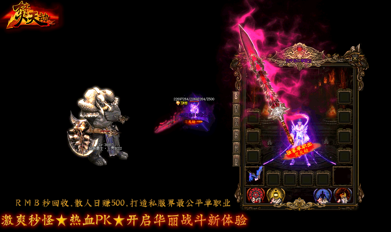 特别介绍:全新设计游戏玩法!全新地图!全新怪物!全新PK理念!全新散人设计!真正的散人好混!玩不出新的感觉随时来和花时间赚不到钱骂财务!
