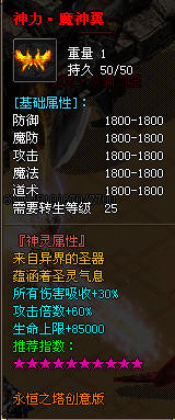 本服封顶700级,转生10转+8重进阶.装备层次分明,全部靠打,BOSS无数,创意版本不得不玩。本服为GOM引擎单职业版本,上线选择战士即可。 |