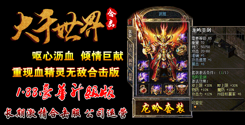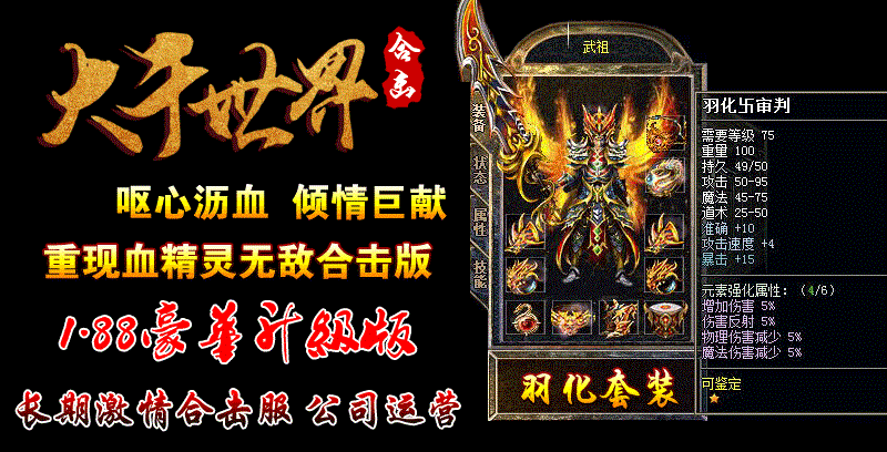 版本介绍:版本介绍 2017 武魂装备爆率非常高 精灵装备爆率高 -无敌-龙吟【好爆】-倚天-统帅【爆率适中】-羽化【看人品】(人民币回收)