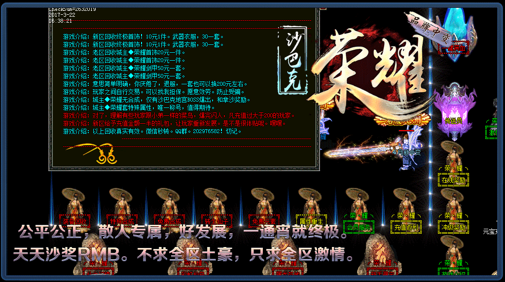 - 版本介绍:沙巴克荣耀2017版,4月独家。特色玩法,打破常规。!激情、耐玩、长久!!