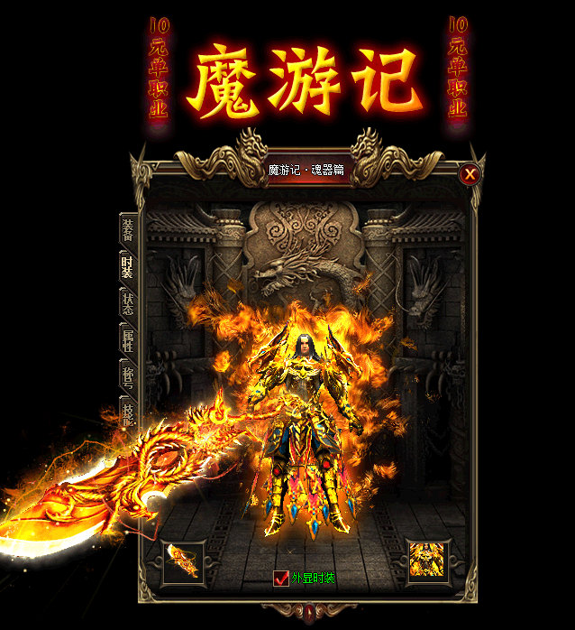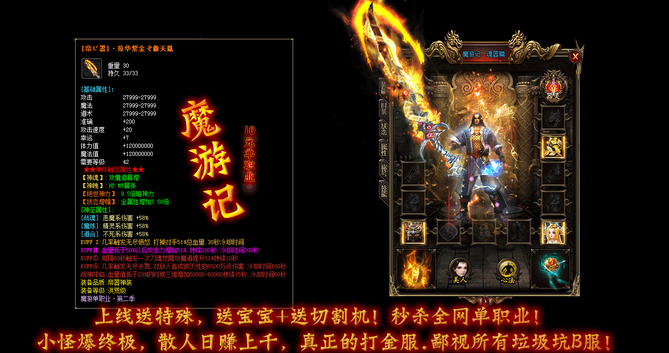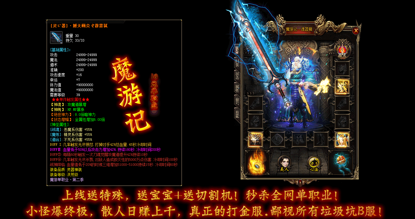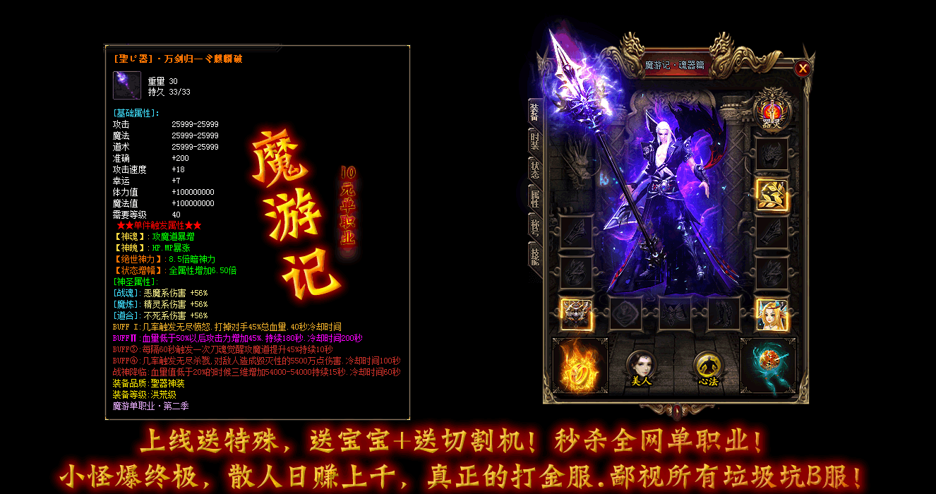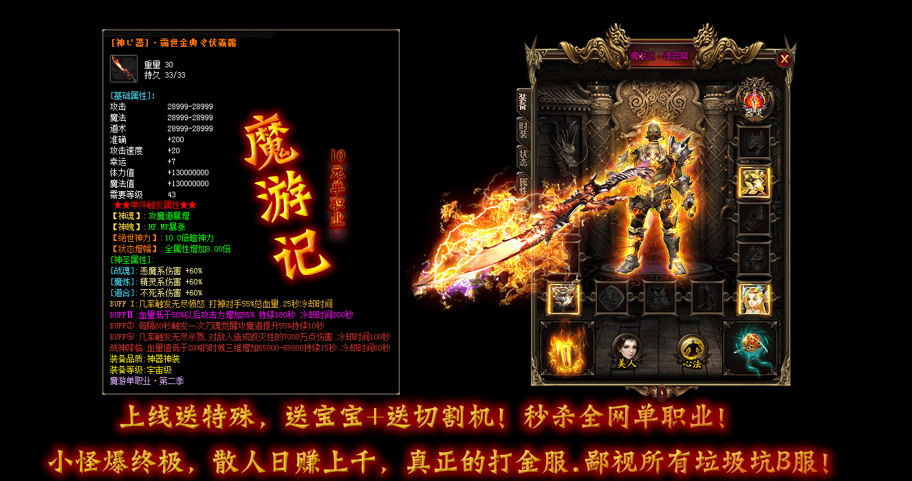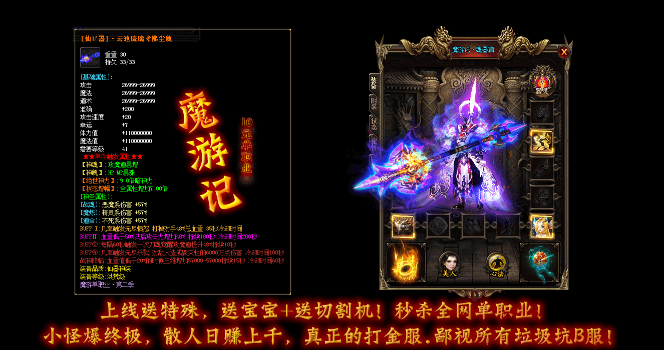 - 充值比例:元宝1:30000 魔游币1:200 点卡网银均赠送100%