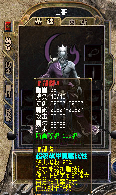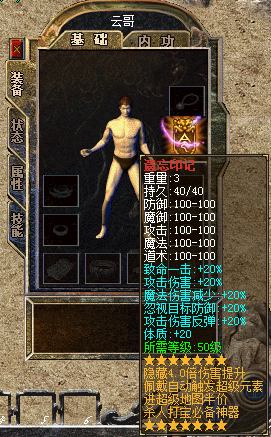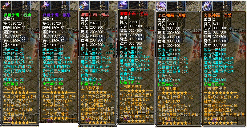 ★★★★遗忘大陆符文篇章具体更新内容如下★★★★ 1.优化第三季怪物爆率,大幅提高金刚盾爆率。 2.增加野外BOSS,终极专爆、会员专爆、材料专爆,爆不爆谁知道等特殊散人活动,使散人玩家前期更换发展。 3.更新第三大陆-遗忘大陆,新增地图二十张左右,新增怪物三十种左右,新增2套特殊装备3套武器衣服,230、255、280、300、350五套装备。 4.新增特色符文系统,全靠爆出,无合成,公平公正!属性?游戏自行体验,符文第一季更新10套符文。 5.新增超神五转,给你不一样的感觉。 6.修复其他遗忘版本属性会爆BUG,新增所有套装均亲自测试。绝对不会爆攻击! 7.新增特色地图,遗忘竞技场,强者的游戏!每小时刷一只终极BOSS,百倍爆率!详情第三大陆查看! 8.符文篇对人物攻击血量数据进行全面测试调整,完全杜绝后期PK秒杀问题!希望给大家带来最激情遗忘版本! |