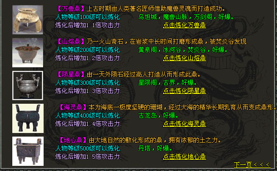 天鼎系统:各大地图都爆天鼎!炼化天鼎可以提升攻击力倍数!有一定几率失败!全部免费的噢!