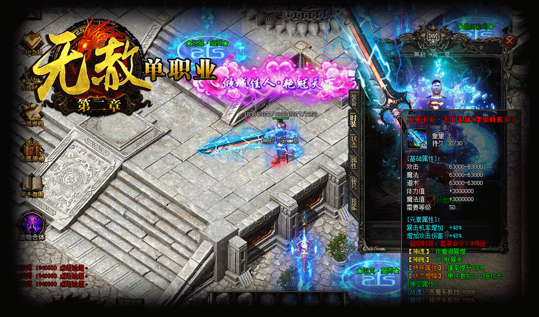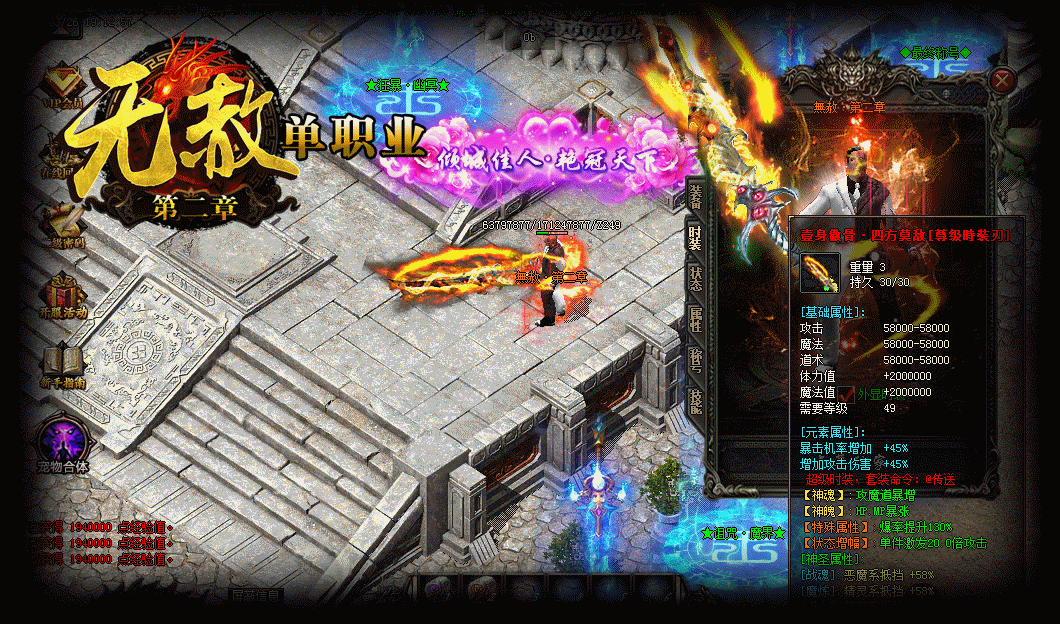 - 【游戏公告】:衣服武器更新至58套,首饰55套,时装50套,装备非常漂亮,不花,PK清晰,不头晕。