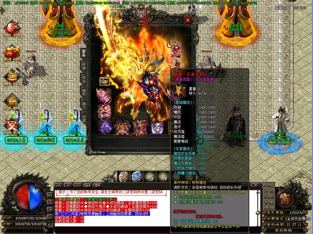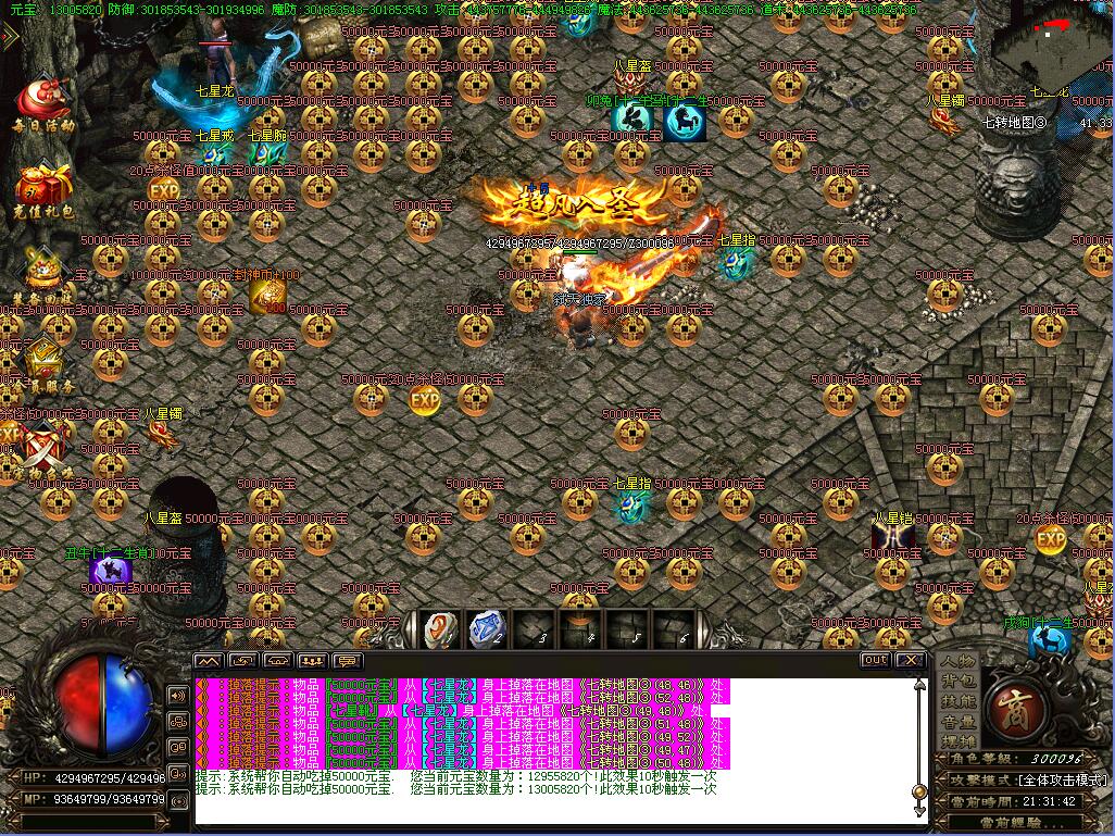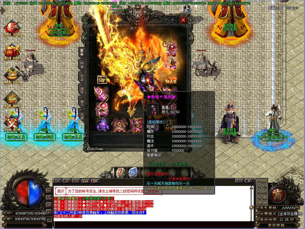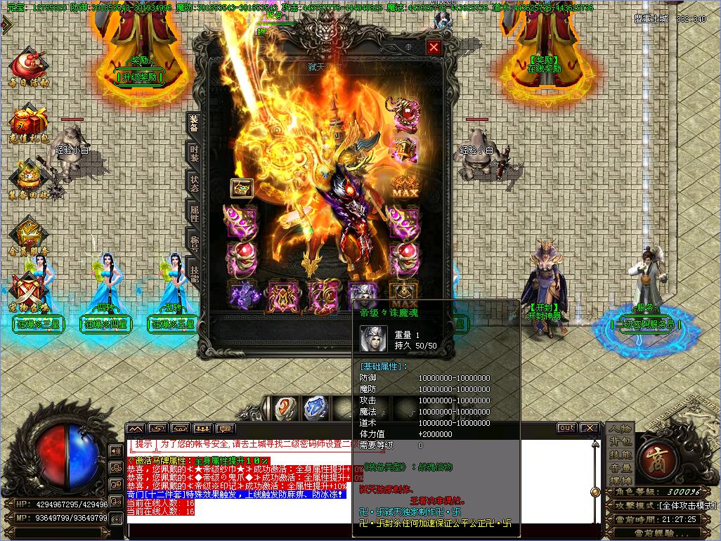 充值比例:1元:2000000元宝.封神币1:500.点卡多送100%网银多送100%.不出售装备和材料,完全公平公正原则,所有人同一起点!