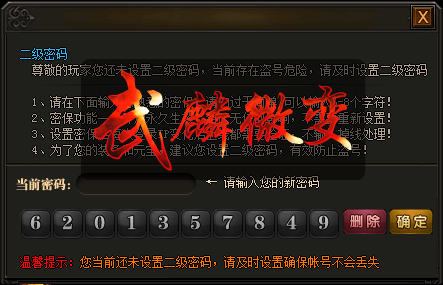- 密码安全: 必须设置二级密码!请勿将账号和密码轻易告诉他人!不要使用过于简单的账号密码,例如1234、1111111等!