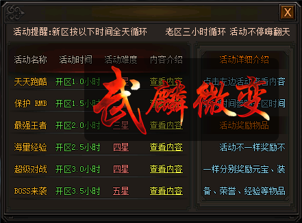 - 游戏活动: 本服活动奖励不停,每四小时循环一次活动系统。全天激情活动等你来体验!