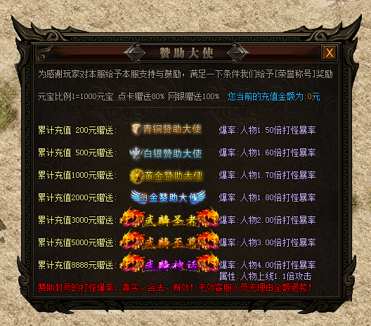 - 元宝比例: 1:1000元宝,点卡赠送:90%,网银赠送:100%,多重多送请查看游戏充值平台!