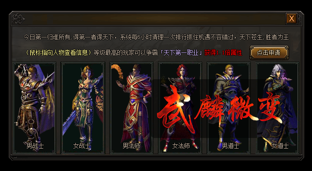 - 版本介绍: 无特戒、无合成、三职业平衡、玩上一分钟你就会爱上它,公平、公正、公开是我们一直坚守的信念,武麟期待您的加入!
