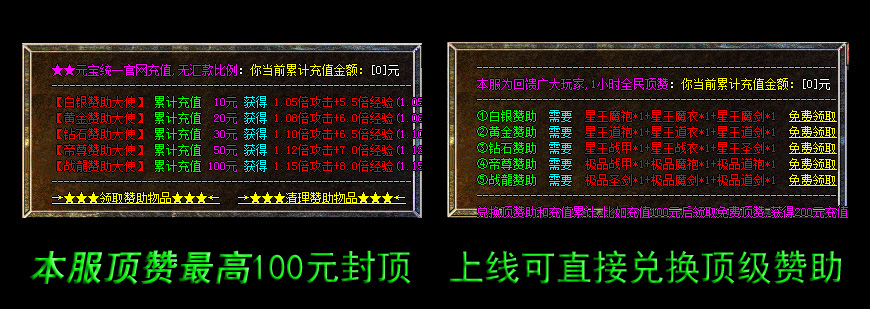 - 【赞助介绍】独家超低消费,顶级赞助设置最高100元,散人可以使用基础装备兑换顶级赞助!
