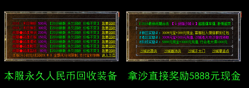 - 【装备回收】本服永久人民币回收装备,无论新区和老区,回收价格一样,任何方式秒到帐!